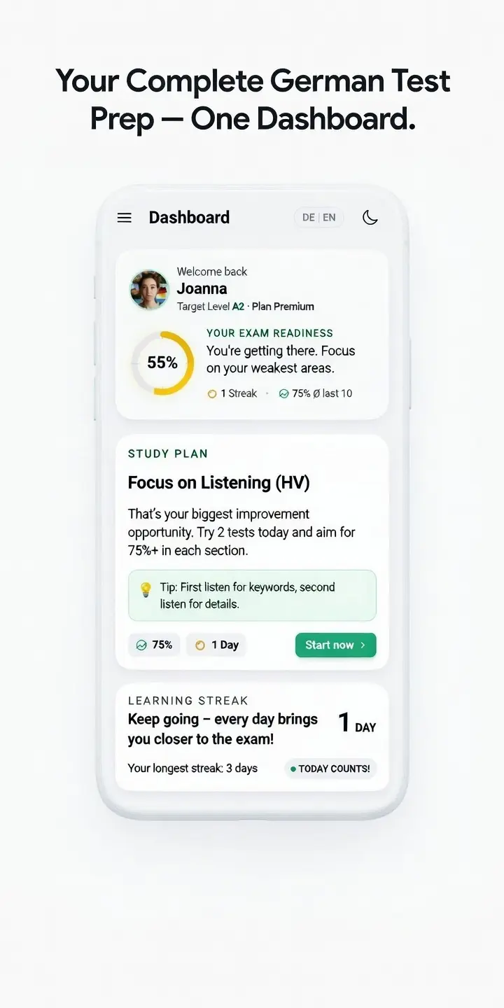 Modelltests, KI-Feedback & personalisierter Lernplan — für alle TELC-Niveaus von A1 bis C2.